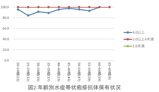 本調査においてEIA抗体価4.0以上の抗体保有率は全体の93.6%でした。年齢群別では、60-64歳、65-69歳で最も高い抗体保有率(100%)を示し、次いで45-49歳(97.7%)、20-24歳(95.7%)、40-44歳(95.7%)、50-54歳(95.7%)、55-59歳(93.1%)、30-34歳(91.4%)が90%以上でした。抗体保有率が最も低い年齢群は25-29歳(84.4%)でした。抗体価が2.0未満の抗体陰性者の割合は、全ての年齢群で0でした。