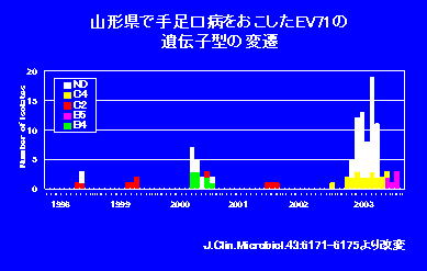 1998年から2003年まで、山形県でもエンテロウイルス71型は毎年夏を中心に検出されています。2003年の検出数は特に多くなっていました。 遺伝子がどのように変化しているかを調べたところ、1-2年でC2→B4→C2→C4→B5と置き換わっていることがわかりました。 (参照:J.Clin.Microbiol.43:6171-6175,2005) |