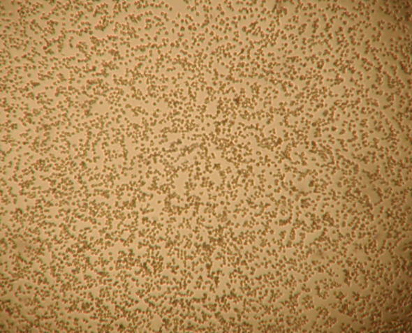 大きく見える細胞がHMV-II、小さく丸いのがモルモット赤血球。ウイルスが増殖したHMV-II細胞にモルモット血球がくっついている(赤血球吸着反応)。 |