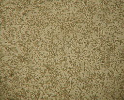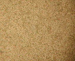 丸みをおびた細胞変性像があちこちに散在している。間はまだウイルスが増殖していない正常細胞。 |