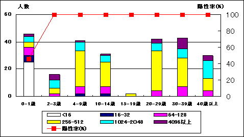 | 今回の調査に関しては、0-1歳(46名)、2-3歳(16名)、4-9歳(41名)、10-14歳(31名)、15-19歳(2名)、20-29歳(42名)、30-39歳(43名)、40歳以上(30名)、合計251名の県民の皆様にご協力をいただきました。どうもありがとうございました。また検査の実施にあたっては、保護者の皆様・関連医療施設のスタッフの皆様のご配慮をいただきました。あわせて御礼申し上げます。 |