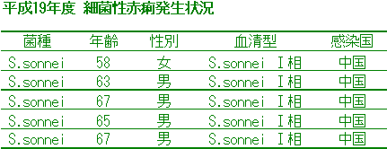 平成19年度は、5人の細菌性赤痢の発生届があり、全員に海外渡航歴がありました。