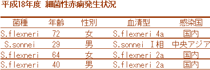 平成18年度は、4人の細菌性赤痢の発生届があり、1人は海外渡航暦がありました。