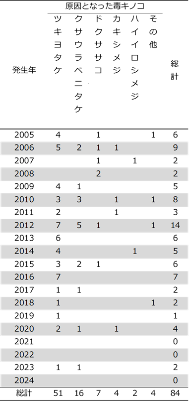 - 2005〜2024年で平均すると、毒キノコによる食中毒発生件数は、年に4件程度。ただし、ここ数年の発生件数は平均よりも小さくなっている
